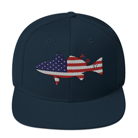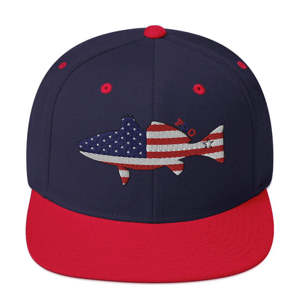 Show off your American pride! Built as the perfect fishing hat for men and women, this navy and red high-profile snapback features an embroidered redfish silhouette filled with the US flag, a perfect blend of patriotic style and fishing lifestyle. Making it the best fishing hat