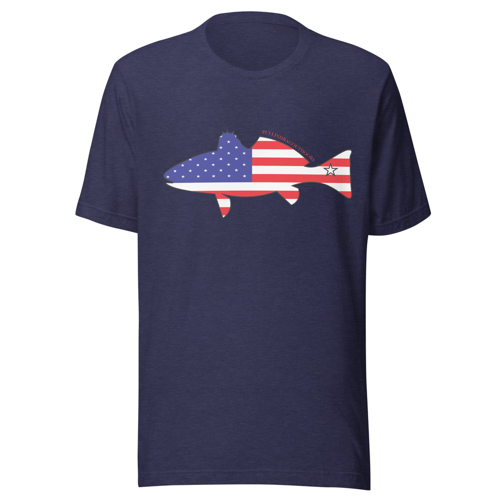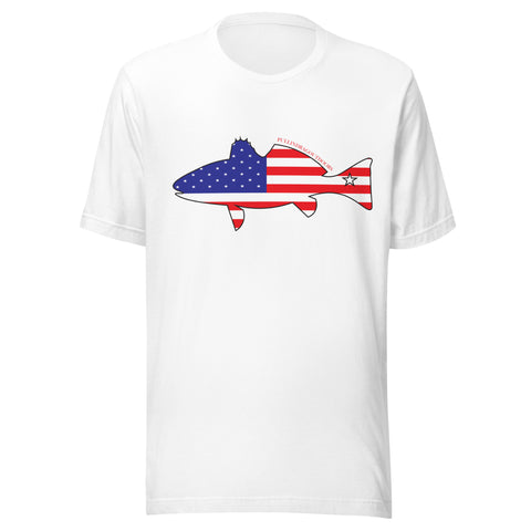 Show your love for Redfish and the United States with the American flag Redfish T-shirt, a bold, patriotic design created for anglers who live life on the Gulf. Featuring a stylized redfish filled with the stars and stripes, this tee blends American pride with the unmistakable silhouette of one of the most iconic inshore gamefish.