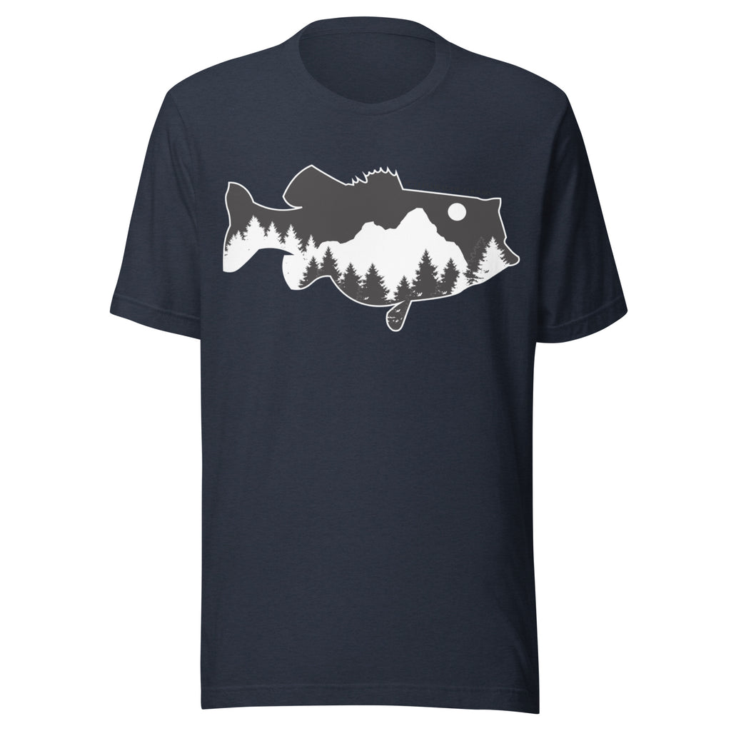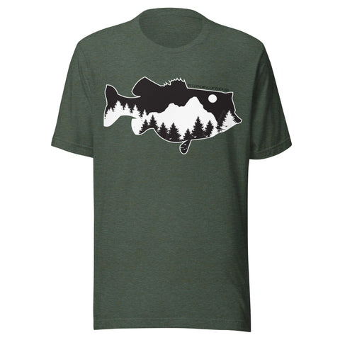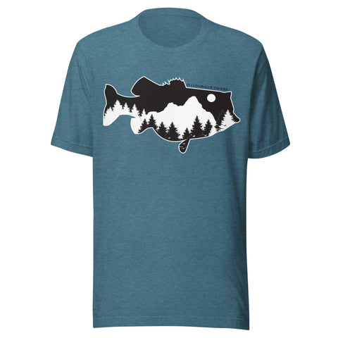Featuring a Largemouth Bass silhouette fitted with mountain peaks, pine trees, and a rising moon, this t-shirt blends the spirit of fishing and wilderness adventure into one clean, striking graphic. A premium shirt designed for anglers who feel at home in the wilderness or fishing the pond. Whether you are fishing Texas lakes, hill-country rivers, or spending some time with the family, this t-shirt is made for everyone who appreciates the Great Outdoors.