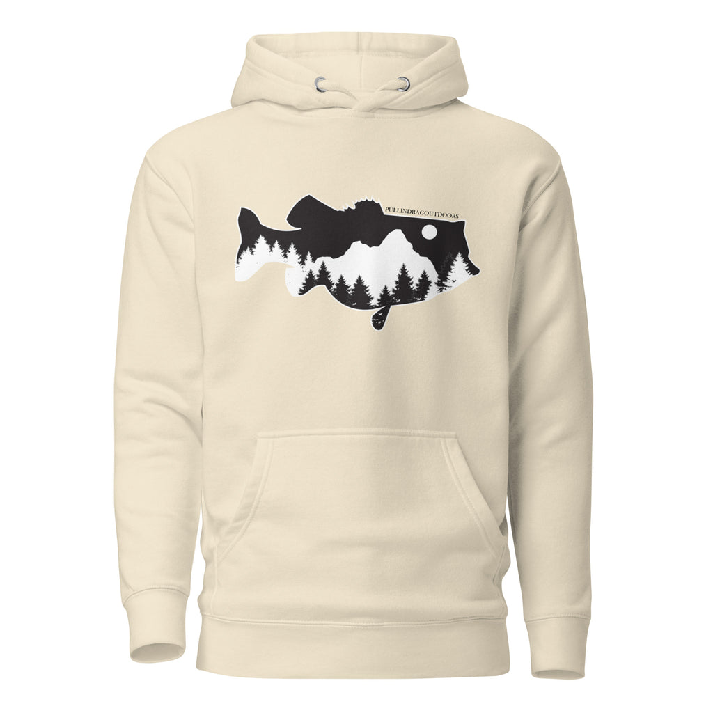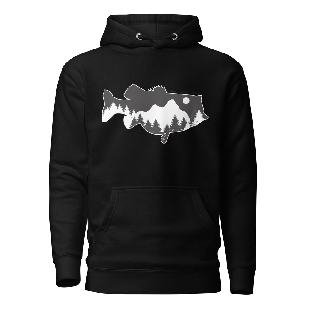 Bring the outdoors wherever you venture with the wilderness bass hoodie. Featuring a largemouth bass silhouette filled with mountain and forest scenery, this hoodie is perfect for anglers, hikers, and anyone who feels at home in the Great Outdoors. Whether you're casting at the local pond or gearing up for a weekend in the woods, this hoodie fits the lifestyle.